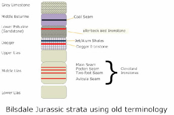 Bilsdale displays the classic Jurassic sequence. All three (Ellerbeck, Dogger, Cleveland iron deposits are present as well as jet and alum. The Cleveland Ironstone forms the valley bottom for much of the dale above Hagg End.